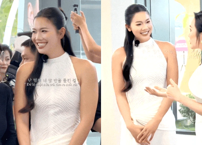 Gương mặt của Ánh Viên đã được chăm chút kỹ lưỡng: làn da mịn màng, sáng khỏe, các đường nét hài hòa, mềm mại. Đặc biệt, nụ cười tươi tắn, tự nhiên của cô trở thành “vũ khí” thu hút mọi ánh nhìn. Không hề gượng gạo, nụ cười truyền tải năng lượng tích cực, khiến người đối diện cũng muốn mỉm cười theo.