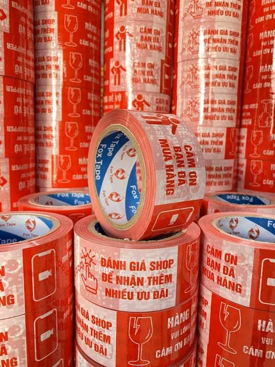 🔥 Băng keo đỏ trắng in chữ cảm ơn bạn mua hàng, quay video, đánh giá 5 sao, hàng dễ vỡ 1kg2 lõi 4li đang giảm giá!