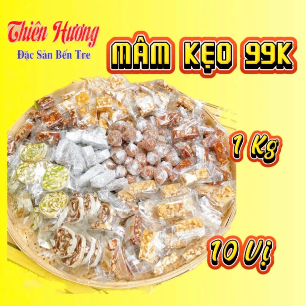 Nếu bạn đang tìm kiếm một sản phẩm kẹo đa vị với giá cả hợp lý, Compo 1Kg Kẹo 99K là một lựa chọn hoàn hảo. Sản phẩm này bao gồm 10 vị kẹo Bến Tre khác nhau, không có kẹo dừa, với giá chỉ 99K.