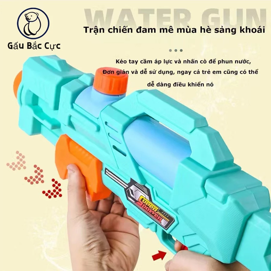 Súng nước này có thiết kế đẹp mắt, với màu sắc tươi sáng và hình dạng thú vị. Đặc biệt, sản phẩm có áp lực cao giúp tăng tầm bắn và độ chính xác, giúp bé có thể chơi thoải mái và vui vẻ.
